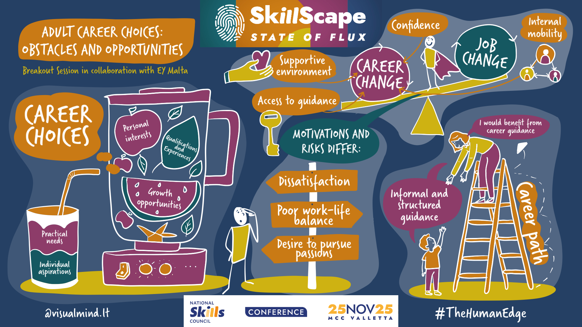 This session encouraged participants to reflect on their own career journey and consider how they can contribute to a stronger, more supportive career ecosystem for others. Drawing on the recent National Skills Council–EY Malta survey, Adult Career & Training Choices, the session explored four themes: career motivations, career barriers, decision-making, and career guidance.