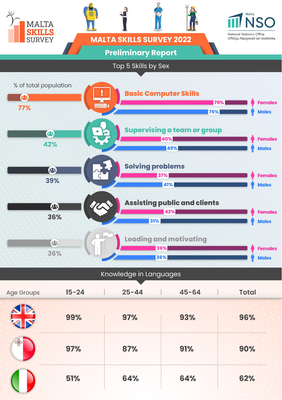 Technological advancements, new business models and national priorities, all effect trends in employment and the required skills development, amongst others. Without the necessary foresight and preparation of the workforce, this inevitably results in skills mismatches and shortages as well as unemployment. Through research undertaken by several institutions in Malta as well as at the European and international levels, maintaining an updated Skills Panorama helps to tackle these challenges, by providing the necessary evidence base on skills needs and labor markets.The National Statistics Office (NSO) conducted the first Malta Skills Survey between October and December 2022. The objective of this survey was to take stock of the range of skills among the working-age population of Malta and Gozo. Such skills profiling is essential to identify skills gap and/or skills mismatch, thereby making it possible for better training and re-training programs